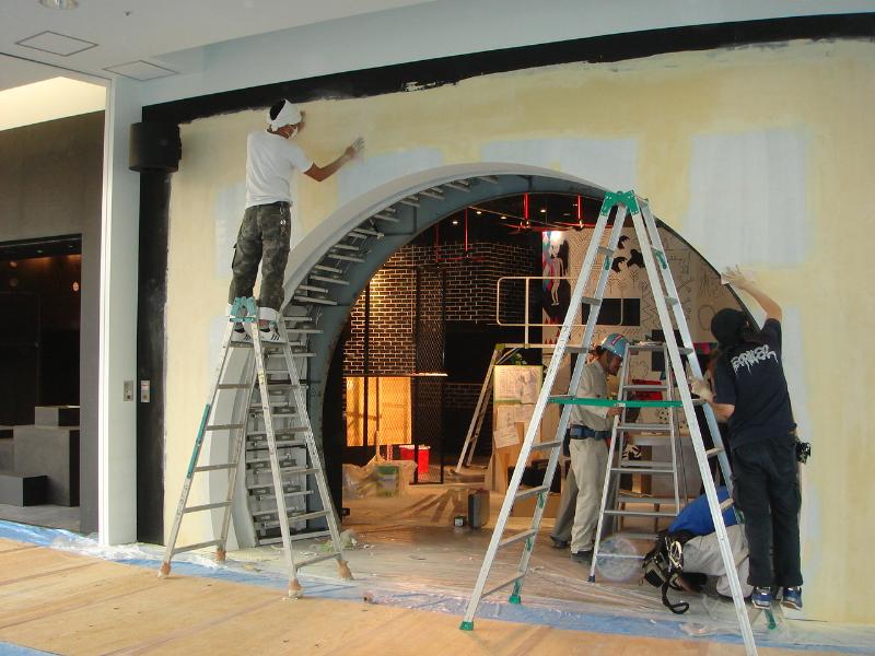 この現場では、照明を覆う光幕を取り付けします。